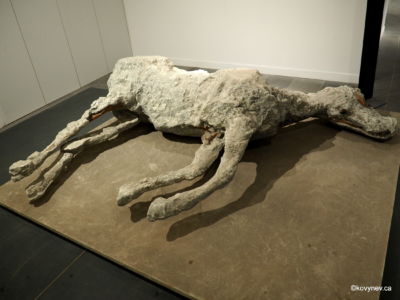 The last stop on our tour of Pompeii is Antiquarium - a small museum, where some of the Pompeian treasures, recovered during the excavations, are exhibited.Most of the valuable archeological finds from Pompeii are now in the National Archaeological Museum in Naples (a must-see site if you are ever in the city).But if you cannot make it to Naples, and Pompeii is your only stop in the area, Antiquarium is a passable substitution.It gives you good samples of all types of treasures found in Pompeii - statues, ⇨⇨ architectural marvels, ⇨⇨ weird crazy-looking dudes, ⇨⇨ mosaics, ⇨⇨ and, of course, frescoes. And much better ones than those that you can see out "in the field", too.But the most poignant exhibits are the plaster casts of the victims of the eruption. Yes, even horses.Note the perfectly preserved calcified bones inside the plaster.Or this cast of a man, who was either sleeping during the eruption, or, most probably, just resigned at one point and met his death peacefully.Not even trying to cover his face.I was told, this is the pose a body assumes when it′s being burnt, even after the death.A mother with her child, probably, burnt alive by the scorching hot ash too.Another child.So that not to leave on such a sad note, before heading back to Naples, try one of the numerous restaurants sitting along the tracks next to the train station Pompei Scavi ("The Excavations of Pompeii"). Like this one, air conditioned and everything.The most obvious thing to try is Neapolitan pizza, as a homage to the birthplace of pizza. This one is Capricciosa (ham and mushrooms), my favorite.And since we are on the subject of food, here are some other things you might want to try in Naples: Parmigiana (baked eggplant with cheese and tomato sauce), ⇨⇨ and Pastiera napoletana (ricotta cheese pie), traditionally served on Easter. This variation is called Pastiera di grano, meaning that puffed wheat grains are added to the filling, making it soft and crunchy at the same time. My Ukrainian waiter swore by it, and I wasn′t disappointed.And finally, hop on a train like this one, to get back to Naples. (Graffiti is a real issue in Naples. I don′t think there is a flat surface left in the whole city that has not been defaced).Press ESC to exit